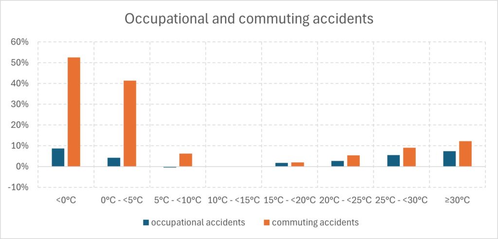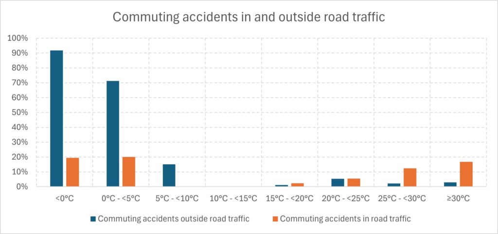 K. Drescher and B. Janzen in their article “When weather wounds workers: The impact of temperature on workplace accidents”, published in the Journal of Public Economics, recently presented an analysis of the temperature dependence of workplace accidents in Switzerland. Using data from 1996 to 2019, they found increased risks at both very low and very high temperatures. We adapted the methodology to investigate accidents in Germany and found very similar results. Additionally, data from the German Social Accident Insurance System can be used to examine commuting accidents, distinguishing between those that occurred in road traffic and those that did not.